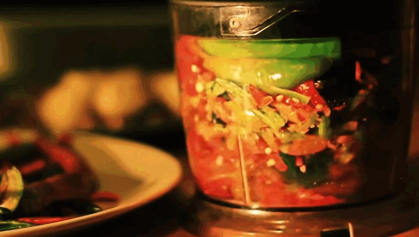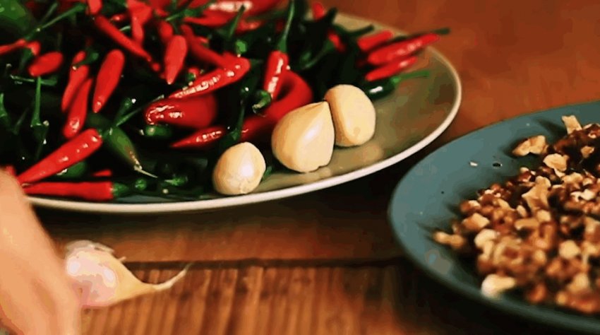Подрібніть у блендері перець із часником, а потім додайте до них горіхи і ще раз увімкніть прилад.![]()