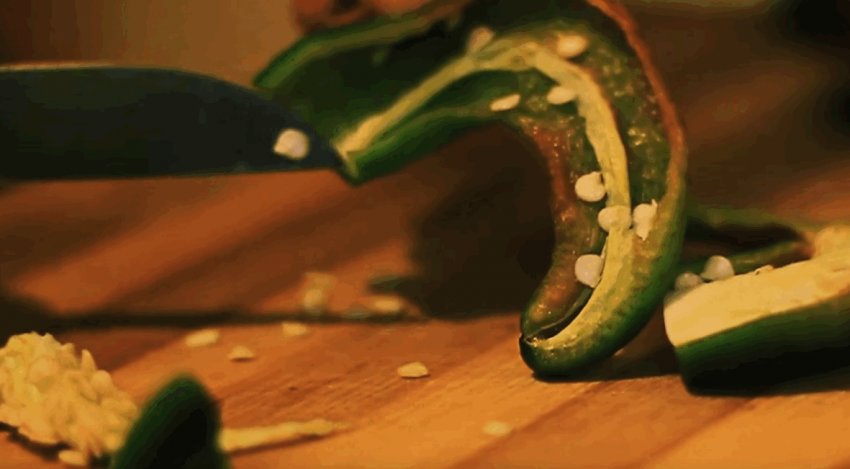 Розріжте кожен гострий перець і відокремте від нього плодоніжку, добре вичищаючи внутрішнє насіння.![]()