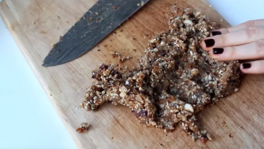 Помістити в блендер-подрібнювач м'які фініки без кісточки, вівсянку, пекан і арахіс. Подрібнити до стану липкої, щільної маси. Якщо маса занадто суха, то для більшої клейкості додати 1 ст. л. води.![]()