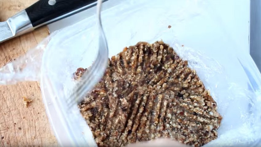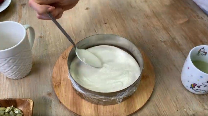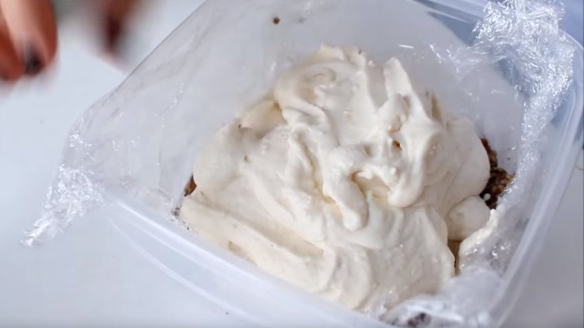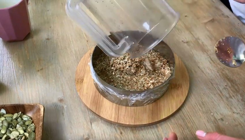 Взяти ємність розміром близько 15х15 см, обернути всередині харчовою плівкою і викласти отриману масу. Рівномірно розподілити по дну, ретельно утрамбувати і відправити в морозильник як мінімум на 20 хвилин.![]()
