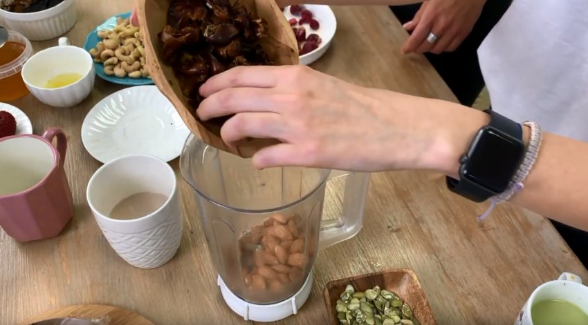 Помістити в ємність фініки і продовжити подрібнення до отримання солодкої однорідної маси.![]()