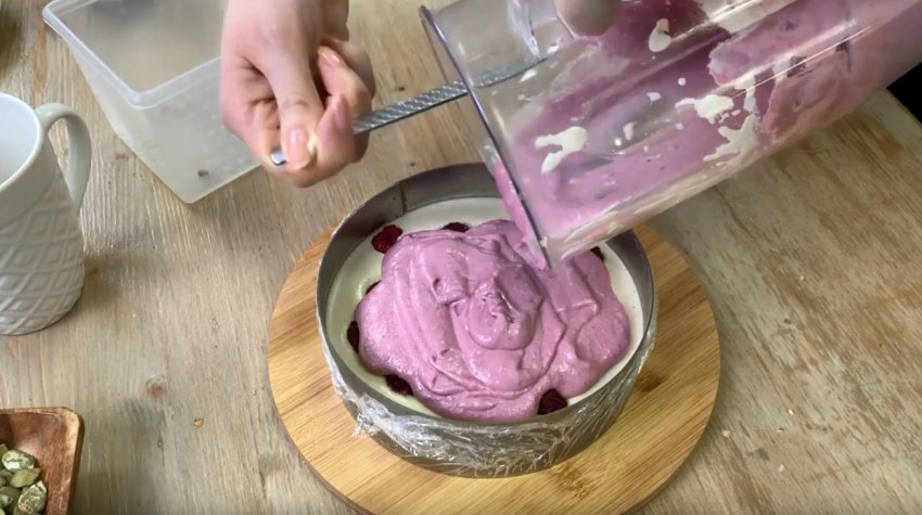 У крем, що залишився, додати малину і ще раз перебити. Вилити в ємність другий шар крему і помістити торт у морозильну камеру до повного застигання.![]()