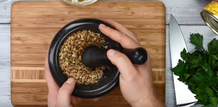 Горіхи подрібнити в ступці, але не дуже дрібно.![]()