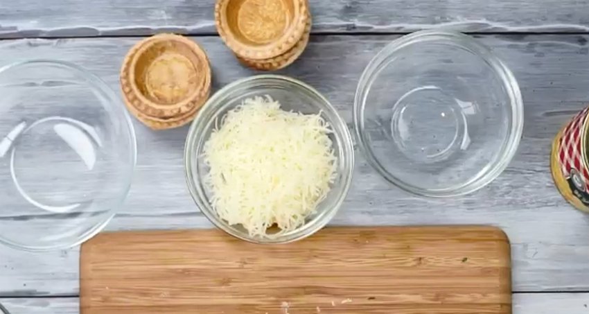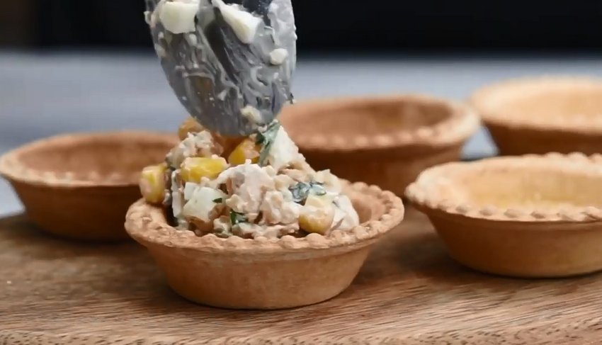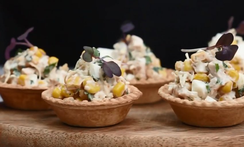 Викласти салат ложкою в тарталетки і прикрасити зеленню.![]()