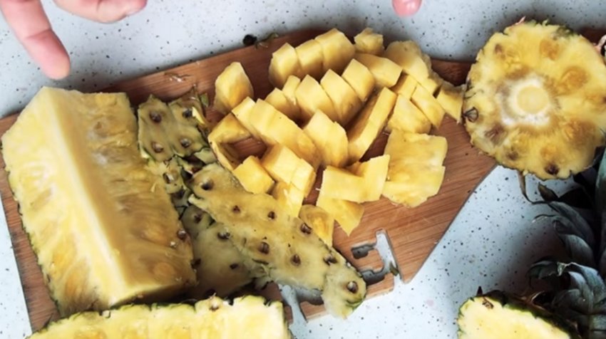 В ананаса відрізати хвостик і носову частину. Відрізати ¼ частину плоду, очистити його від шкірки, відрізати жорстку серединку і нарізати його кубиками.![]()