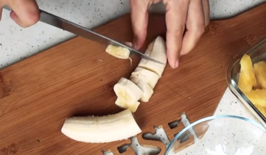 Банан очистити від шкірки і порізати на такі ж шматочки, як і ананас.![]()