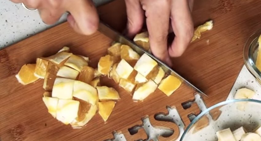 Апельсин очистити і нарізати кубиками відповідного розміру. Сік, що виділився, не потрібно виливати.![]()