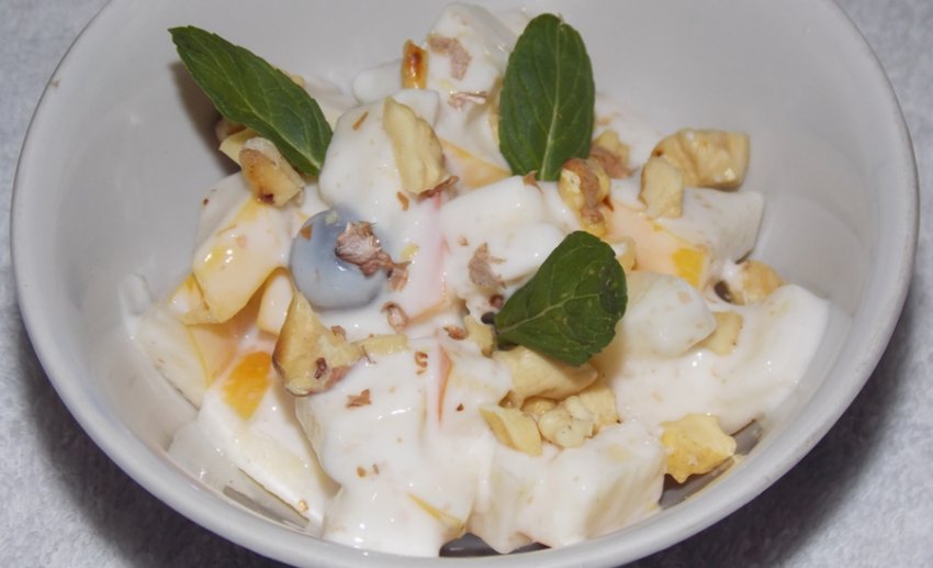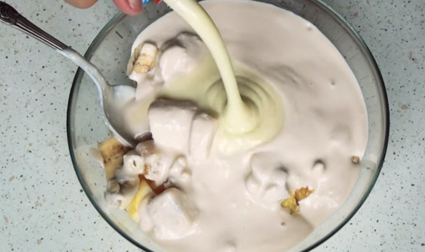 Фрукти і горіхи викласти в глибоку салатницю, залити ряжанкою, додати згущене молоко і апельсиновий сік, якщо є. Усе добре перемішати.![]()
