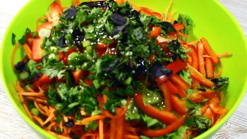 Овочі та зелень викласти в салатницю і залити заправкою. Поставити в холодильник на 30 хвилин.![]()