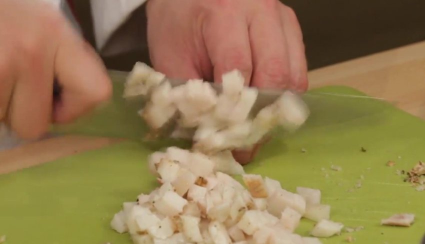 Поріжте сало на дрібні кубики і перемістіть його в чашу мультиварки, заздалегідь змащену олією.![]()