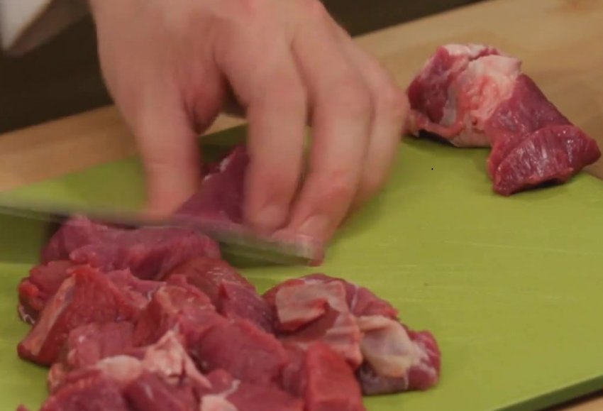 Виберіть на приладі режим "Жарка" і поки сало топиться, наріжте промите яловиче м'ясо великими кубиками і трохи меншими частинами подрібніть підготовлену моркву.![]()