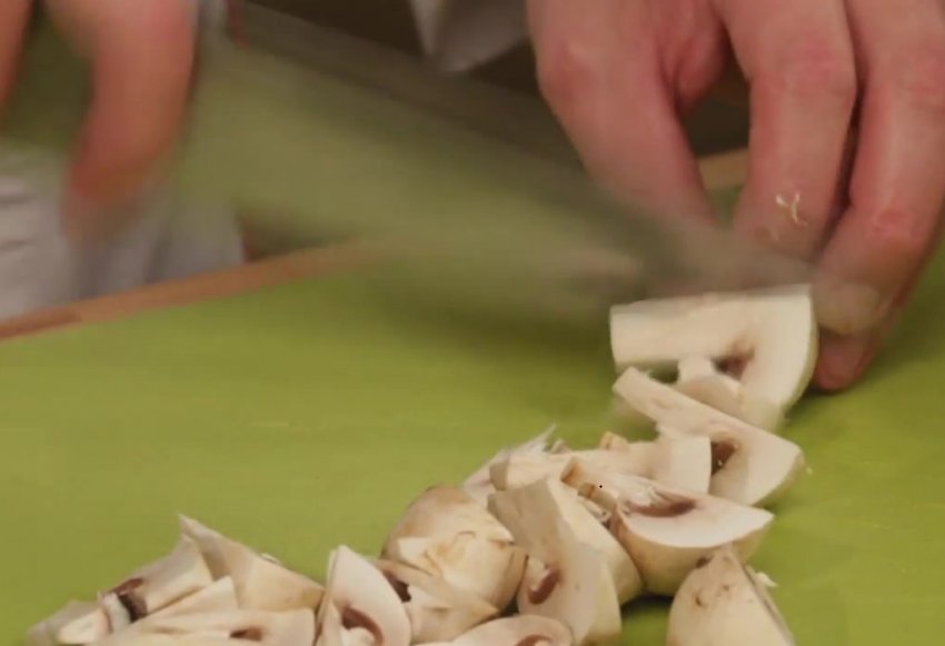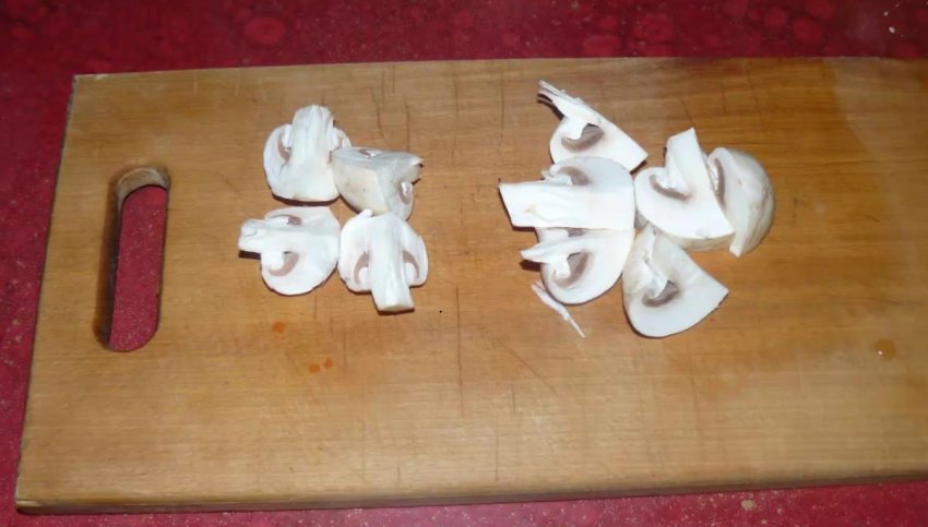 - Сполосніть гриби (можна протерти капелюшок печериць вологою чистою серветкою) і так само наріжте їх на великі частини.