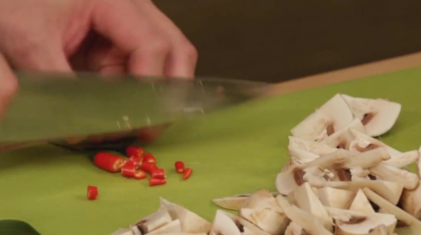 Дрібно наріжте перець чилі і, разом із грибами, висипте його до м'яса, добре все перемішуючи.![]()