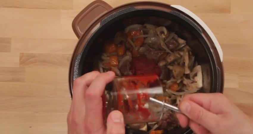 За п'ять хвилин до закінчення процесу смаження, вилийте в чашу томатну пасту і ще раз все добре перемішайте.![]()