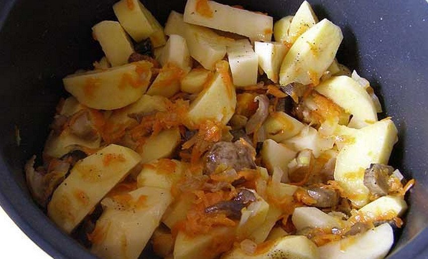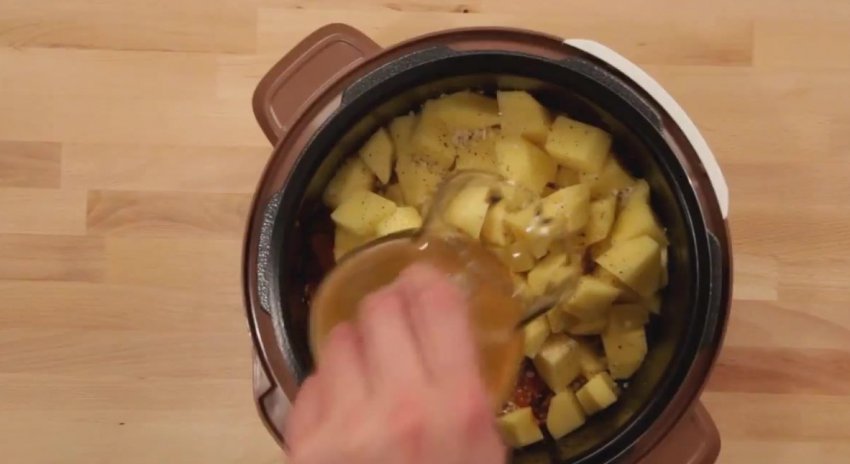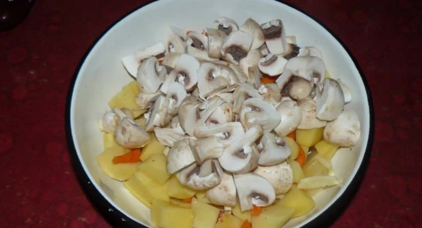 Після додавання печериць або будь-яких інших грибів, встановіть мультиварку на 50-хвилинний режим тушкування, додайте до картоплі дві мультисклянки води та закрийте кришку приладу (на сковорідці страва готуватиметься такий самий час).![]()