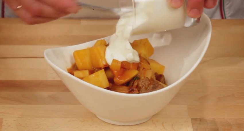 Щойно м'ясо підрум'яниться, додайте до нього кільця цибулі та столову ложку просіяного борошна, після чого ретельно все перемішайте (з борошном готова картопля збереже свою кубічну форму та матиме цілісніший вигляд у готовій страві).![]()