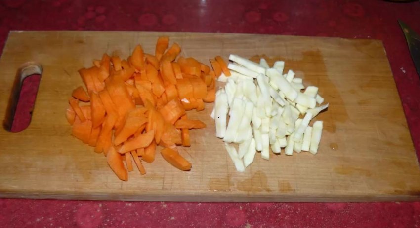 Почистіть моркву і пастернак, наріжте їх тонкою соломкою і висипте до картоплі. Корінь пастернаку додасть страві невеликої солодкості.![]()