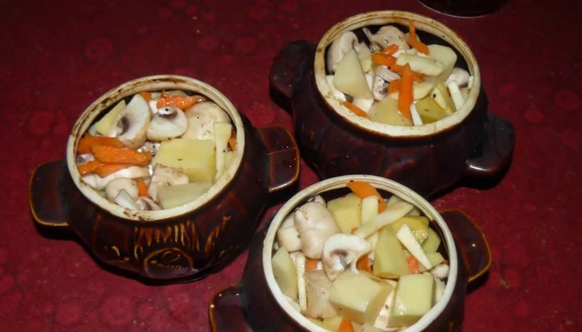 Змастіть стінки підготовлених горщиків рослинною олією і розкладіть у них отриману суміш. Додайте в кожен горщик трохи чистої кип'яченої води, щоб вона злегка покрила нарізані продукти.![]()