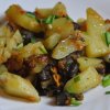 - Наріжте картоплю великими брусками й обсмажте на сковорідці в невеликій кількості олії