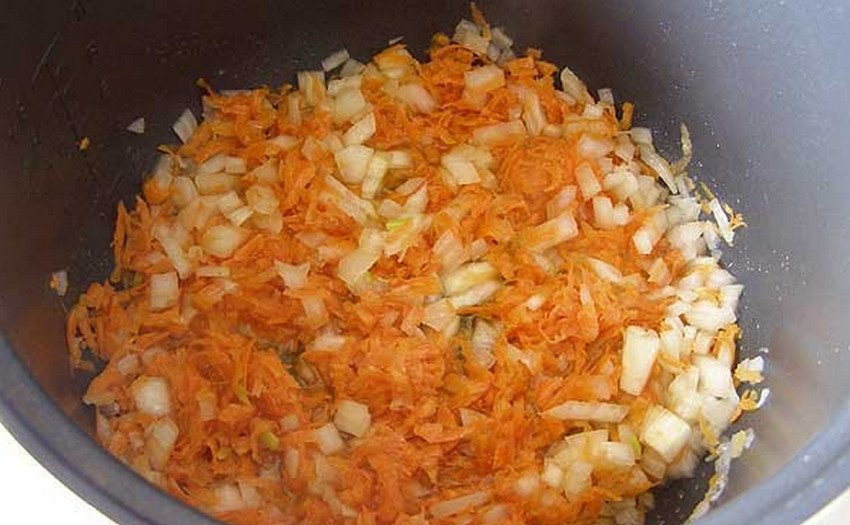 Нашаткуйте очищені цибулю і моркву, обсмажте їх у невеликій кількості рослинної олії на сковороді або в чаші мультиварки.![]()