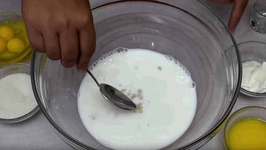 У тепле молоко додати дріжджі та 5 г цукру, розмішати.![]()