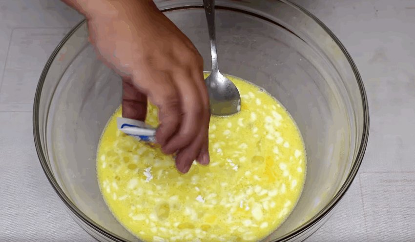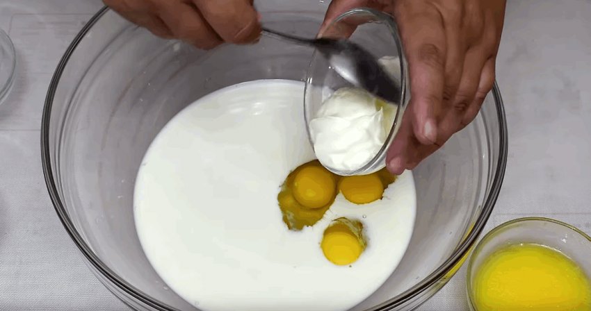 Поки дріжджі "оживають", збивають інші компоненти. У суміш входить сметана, одне яйце, розтоплене масло (2 ст. л. відкласти на начинку), цукор, що залишився, і сіль.![]()