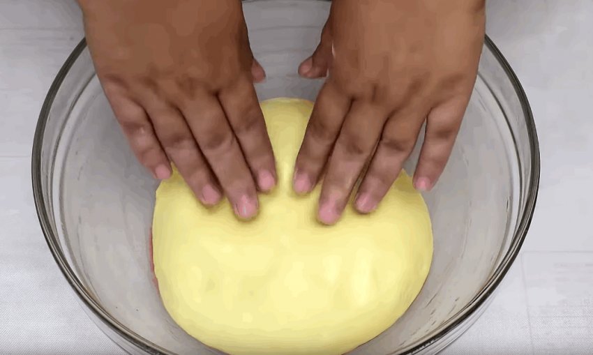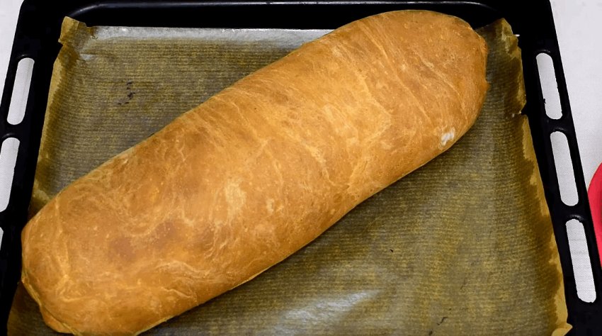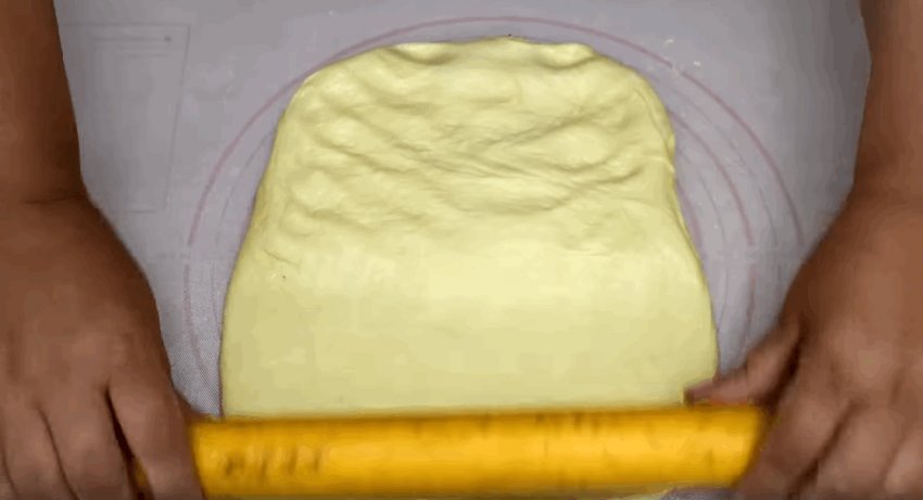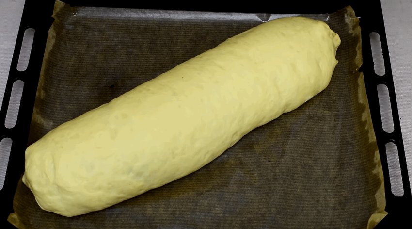 Тісто, що підійшло, потрібно ще раз вимісити, додавши борошно, і дати постояти ще 30-40 хвилин. Після розкачати у вигляді прямокутника товщиною 0,5 см.![]()