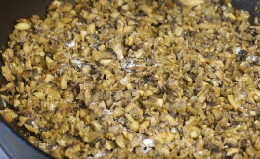 Додайте до шалота гриби та ретельно перемішайте. Смажені печериці виділяють сік, тому потрібно їх обсмажувати і перемішувати доти, доки волога повністю не випарується.![]()