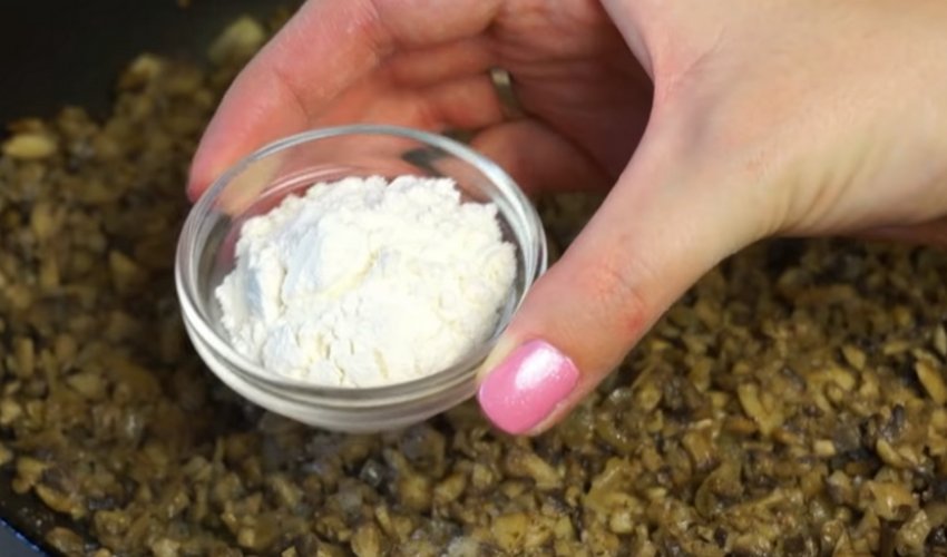 Поверх суміші грибів і цибулі висипте борошно - воно використовується як згущувач соусу. Ретельно змішайте всі інгредієнти.![]()