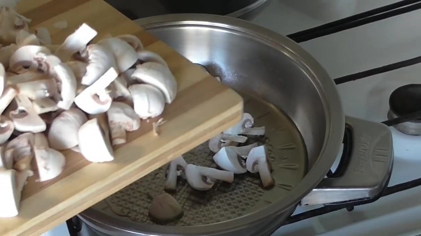 Далі необхідно випарувати зайву рідину з грибів. Для цього потрібно взяти пательню з кришкою, що щільно закривається, товстим дном і спеціальною поверхнею, що дає змогу готувати без олії. Гриби рівномірно розподілити по сковорідці та підсмажити 2-3 хвилини на середньому вогні.![]()