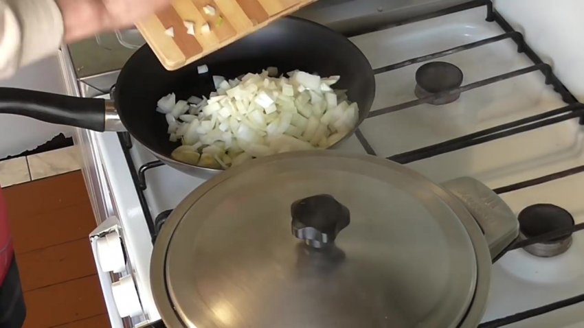 Цибулю очистити і порізати тонкими півкільцями, потім тушкувати 10 хвилин на середньому вогні, поки вона не стане м'якою і прозорою.![]()