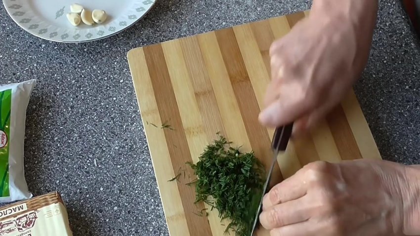 Підготувати кріп: промити його в холодній воді та нарізати дуже дрібно, жорсткі стебла викинути.![]()