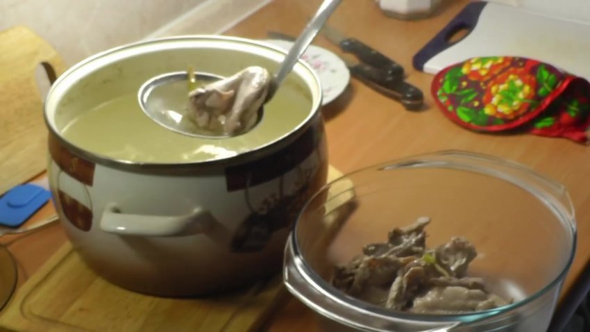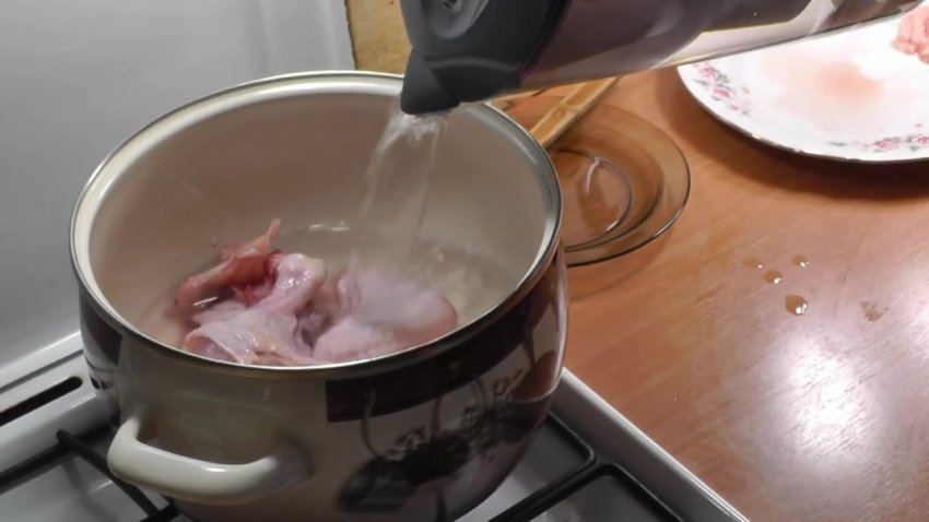 - Ретельно помити м'ясо, опустити його в каструлю, залити водою, додати прянощі, поставити на плиту і довести до кипіння. Час від часу потрібно збирати піну за допомогою ложки. Варити стегенце до готовності близько півгодини.