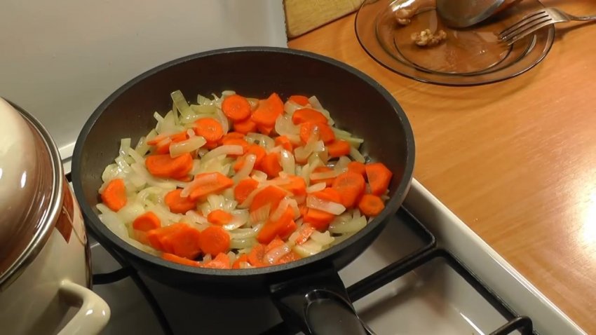 - У сковороду влити олію, скласти цибулю, підсмажити до золотистого кольору, всипати моркву, обсмажувати 5 хвилин. Після додати почищені, нарізані слайсами печериці, перемішати і смажити до повного випаровування грибної рідини.