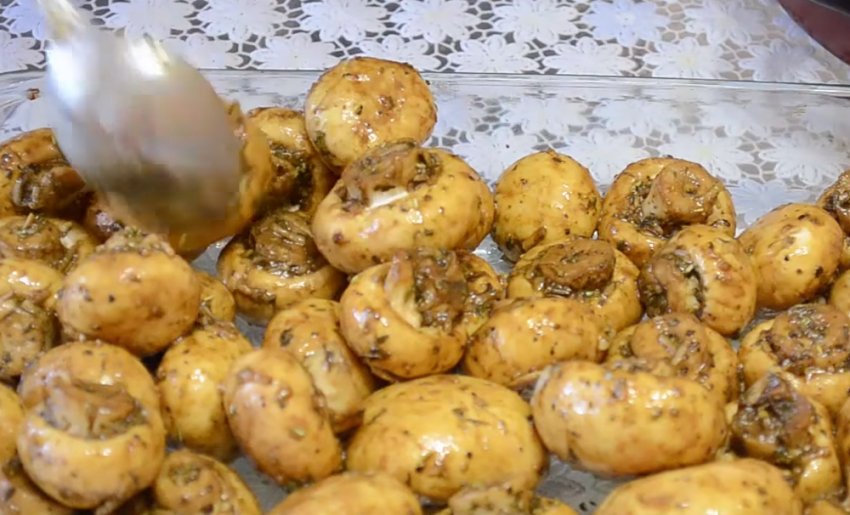 Для запікання цілком вибирайте гриби однакового розміру з шапками близько 3 см у діаметрі. У цьому разі вони приготуються рівномірно за однаковий проміжок часу. Перед приготуванням печериці потрібно ретельно промити, почистити ніжки, видалити спідниці. За бажання можна зчистити шкірку з шапок, але це не обов'язково.