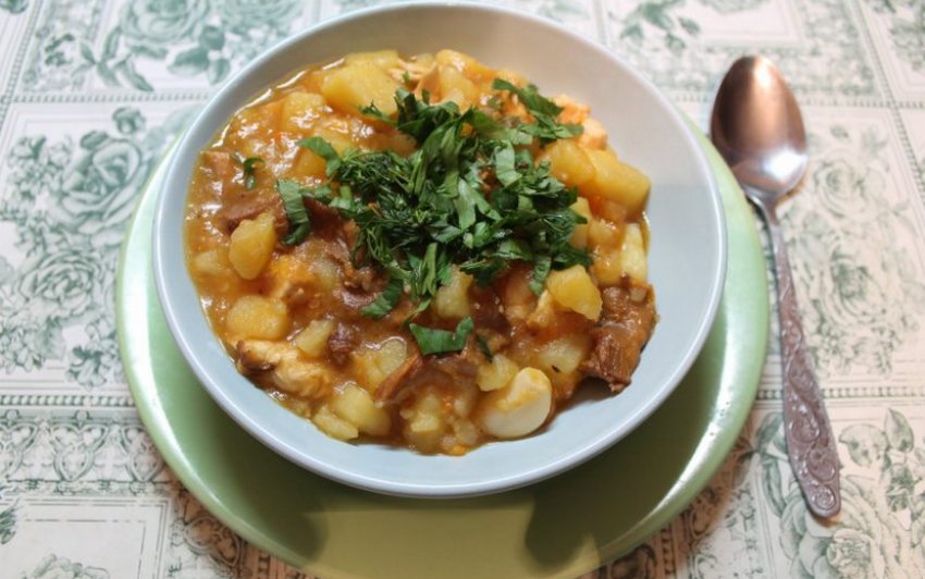 - За 10 хвилин до готовності додати зелень, акуратно перемішати вміст, щоб часточки картоплі залишалися цілими. Спробувати, якщо страва готова, її можна залишити на 10-15 хвилин у режимі "Підігрів".