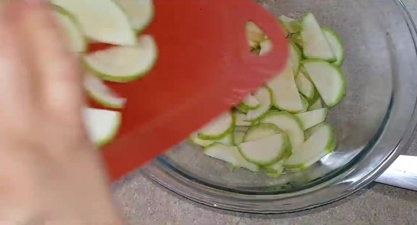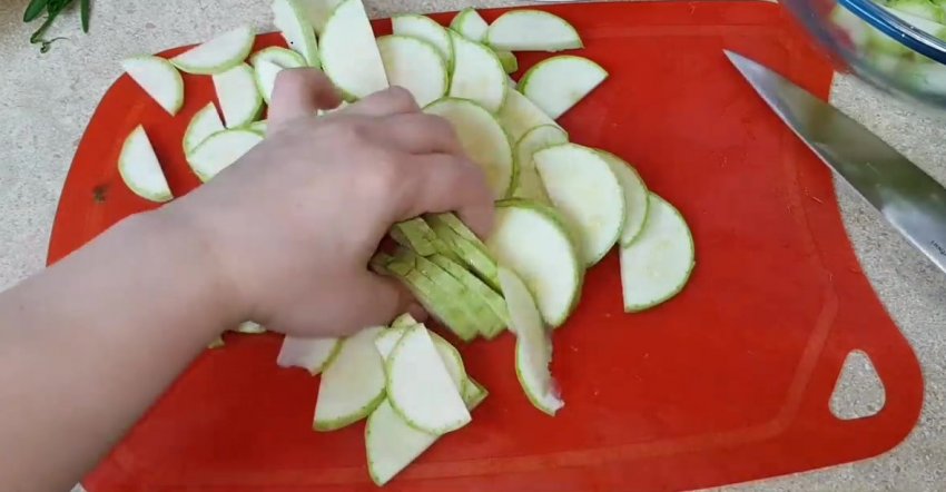 Розрізати кожен кабачок на часточки або кубики. Їхній розмір може бути будь-яким, на ваш розсуд.![]()