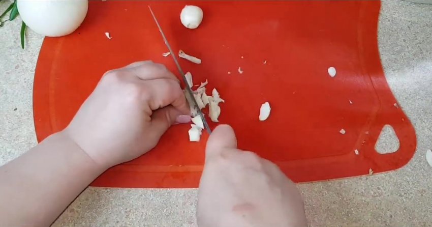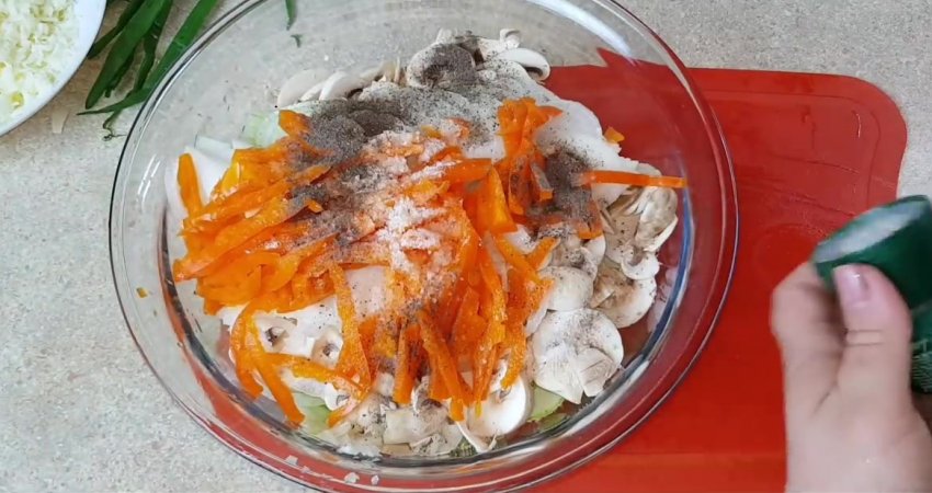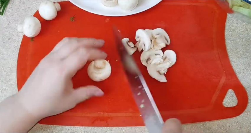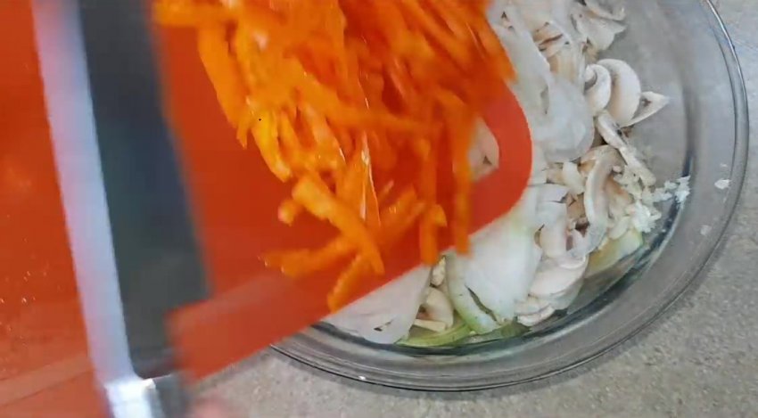 Кожен гриб розрізати на слайси і додати до овочів.![]()