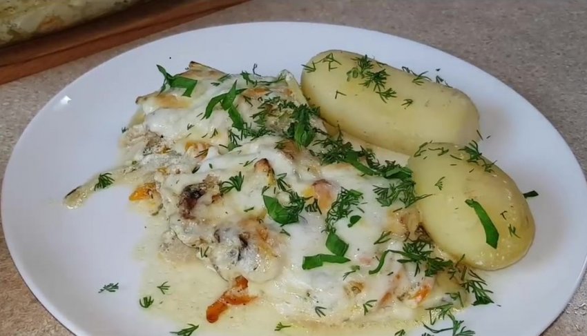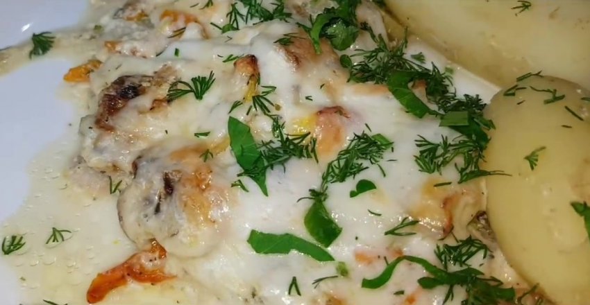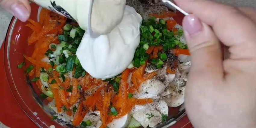 Залити все сметаною, посипати зеленою цибулею і гарненько перемішати.![]()