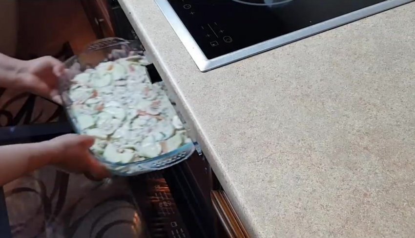 Перекласти всі інгредієнти на скляне термостійке деко і щільно утрамбувати.![]()