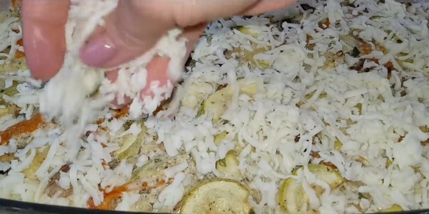 Витягнути деко, потерти сир на кабачкову запіканку і поставити її готуватися ще на 15 хвилин. Випікати за тієї ж температури до рум'яної скоринки.![]()