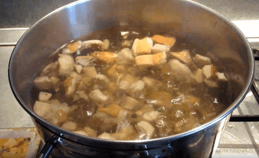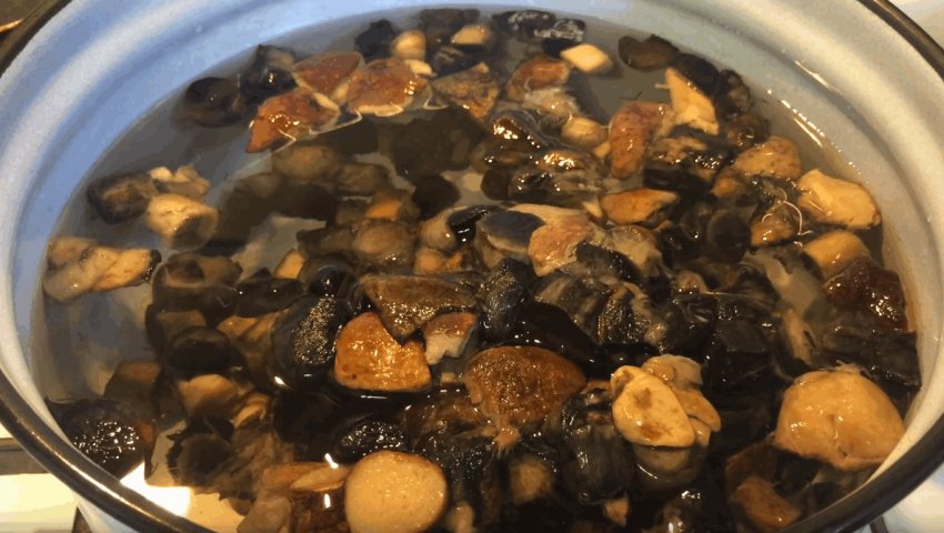 Перекласти гриби в каструлю, влити воду, нагрівати на повільному вогні. Після того, як рідина закипить, варити ще півгодини.![]()