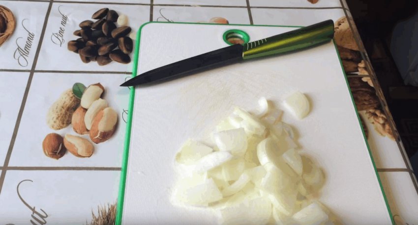 - Очищену цибулину нашаткувати кубиками середніх розмірів.