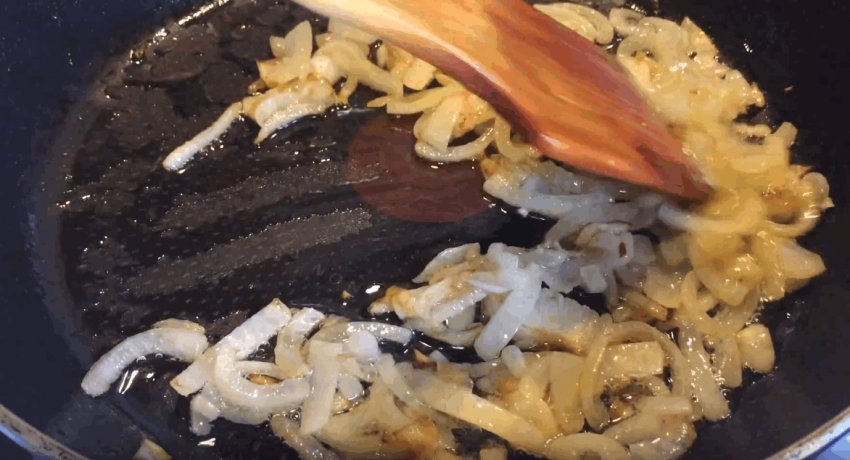 Нашатковану цибулю трохи притомити на сковороді (до прозорості) з додаванням невеликої кількості олії.![]()