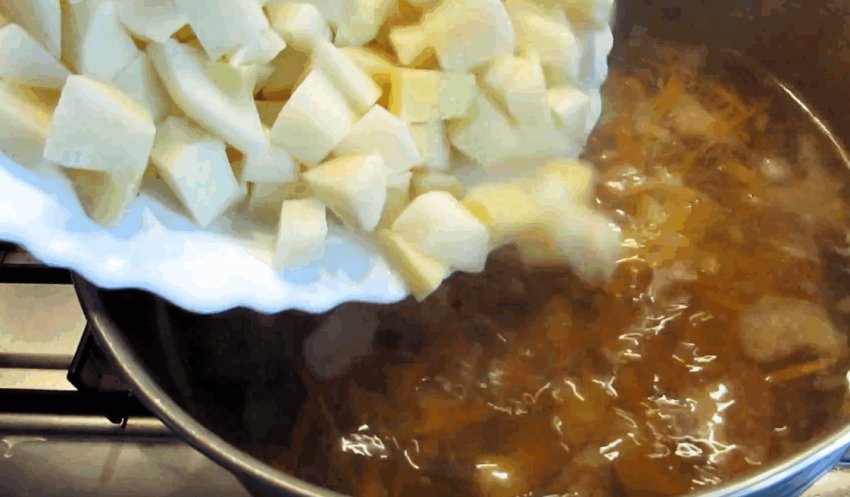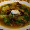 Варити страву ще близько 20 хвилин при слабкому кипінні, поки картопля не стане м'якою. Час варіння залежить від сорту картоплі. Тому, якщо вона не встигла зваритися, залишити варитися до готовності. Заправити страву пасерованою цибулею.![]()