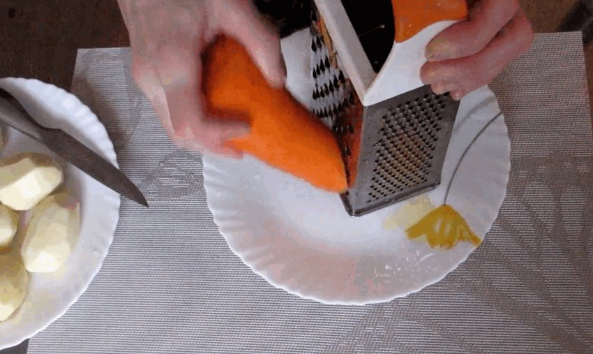 Очищену моркву нарізати у формі соломки. Бульби картоплі, очищені від шкірки, нашаткувати у формі брусочків.![]()