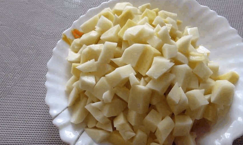 - Підготовлену картоплю нарізати кубиками середніх розмірів.