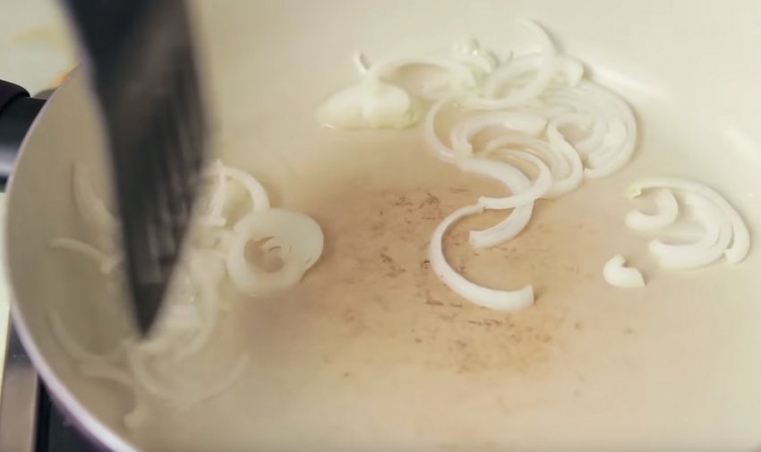 Припустити цибулю на рослинній олії на розпеченій сковороді і додати гриби. Усе тушкувати до м'якості грибів. Наприкінці підсолити.![]()