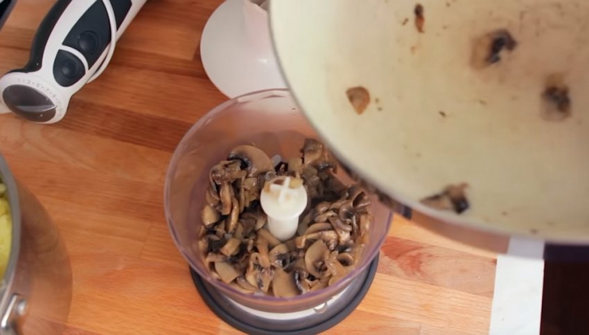 Перекласти подрібнену грибну масу до картопляного пюре, знову додати курячий бульйон і пюрирувати все занурювальним блендером.![]()