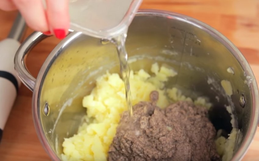 Розім'яти відварену картоплю або подрібнити занурювальним блендером.![]()